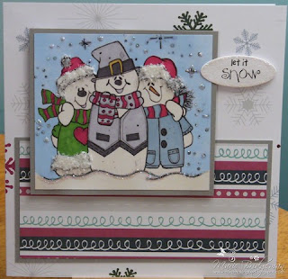 Marie has also created a fantastic card using the Snowfriends image as well. The image is colored wonderfully and matches the fun pattened paper and I love all the little snowflakes on the card base.