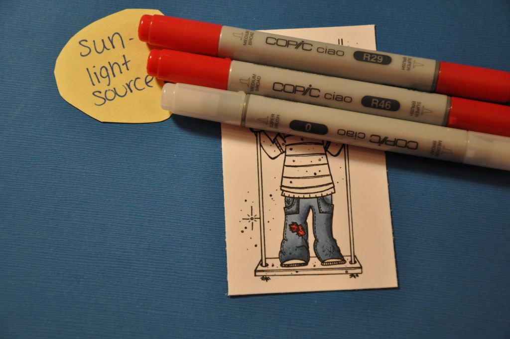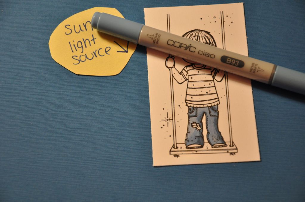 Using the medium color (B95) go over the dark area you just colored and add some more color. Leaving enough area to color where the sun will hit first for the lighest color. To blend the colors together go over in little circles to evenly blend the Copics together.