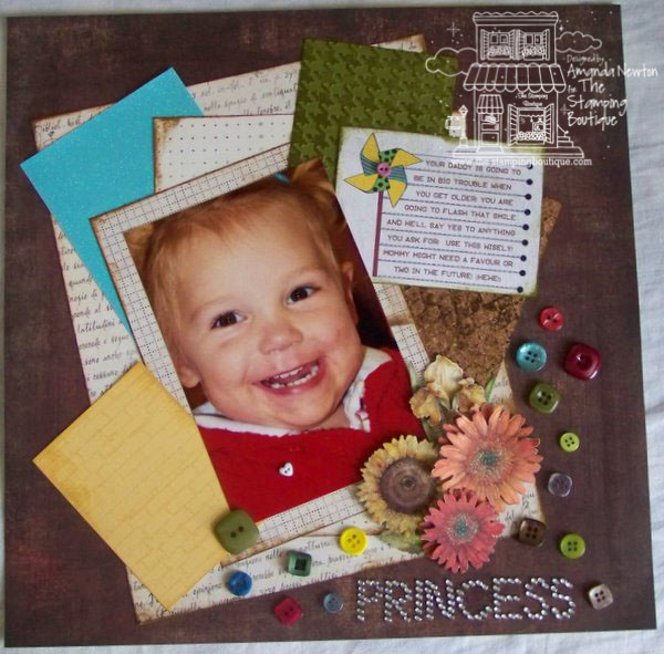Another scrapbook page....I am so blessed to have scrappers on this DT. I love that we can show that TSB images are not just for cards but can be used for ANYTHING. I love these layers...all the papers behind it the main image is just great and do you see The Stamping Boutique image? It's the pinwheel journaling box....it's fantastic right? Tracey just put these in the store...I know you want one!!!